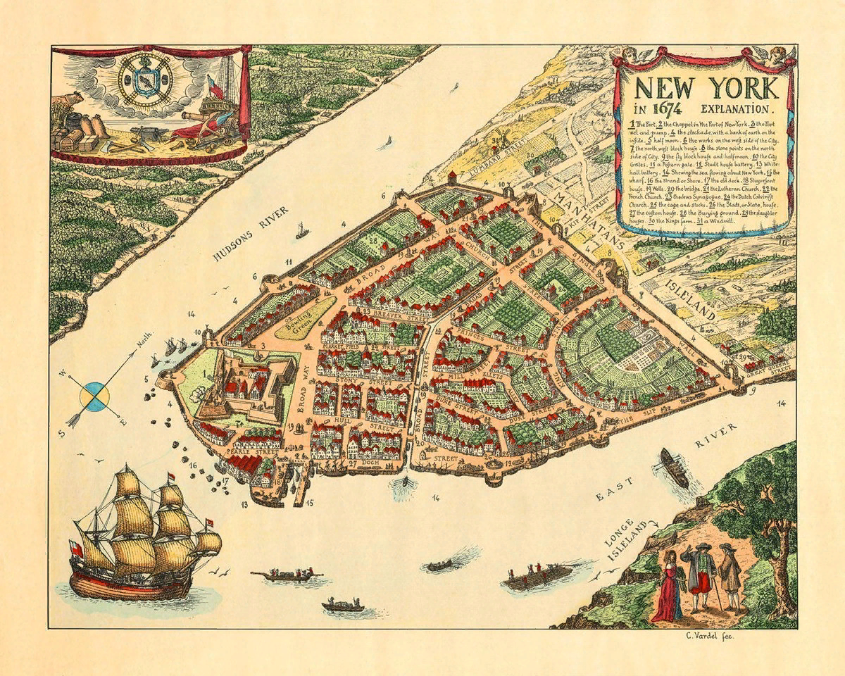 В 1625 году Голландская Вест-Индская компания основала Новый Амстердам на южной оконечности острова Манхэттен в качестве столицы своей колонии и резиденции правительства, с фортом, чтобы защитить его и охранять гавань и драгоценные меховые грузы от английских или французских набегов. Питер Минуит из Голландской Вест-Индской компании, возглавлявший ее с 1626 года, решил купить остров Манхэттен у группы местных индейцев за товары стоимостью 60 голландских гульденов, которые позже были оценены в 24 доллара США.
