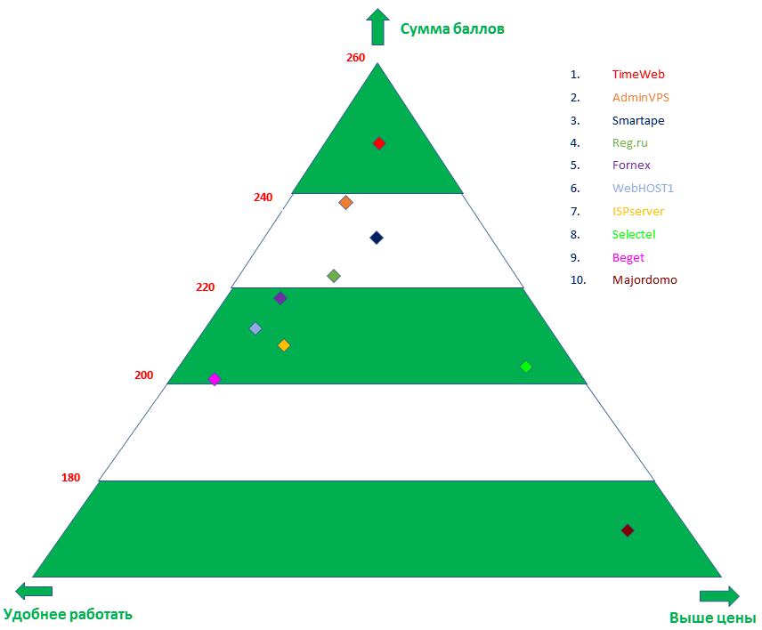 Для наглядности результатов нашего рейтинга мы представили участников в виде пирамиды. Распределили их по количеству итоговых баллов снизу вверх, а также с учетом удобства работы и минимальных расценок влево и вправо соответственно. При первом же взгляде понятно, что лидирует компания TimeWeb, которая набрала наибольшее количество баллов и имеет лучшее соотношение стоимости и качества. На самой низкой ступени оказался провайдер Majordomo, который набрал суммарно невысокое количество баллов, но имеет невысокие цены.