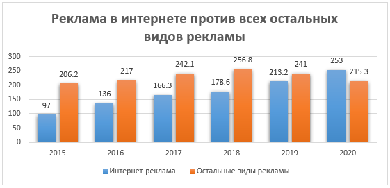 Начиная с 2020 года объем рекламы в интернете превышает все остальные виды рекламы