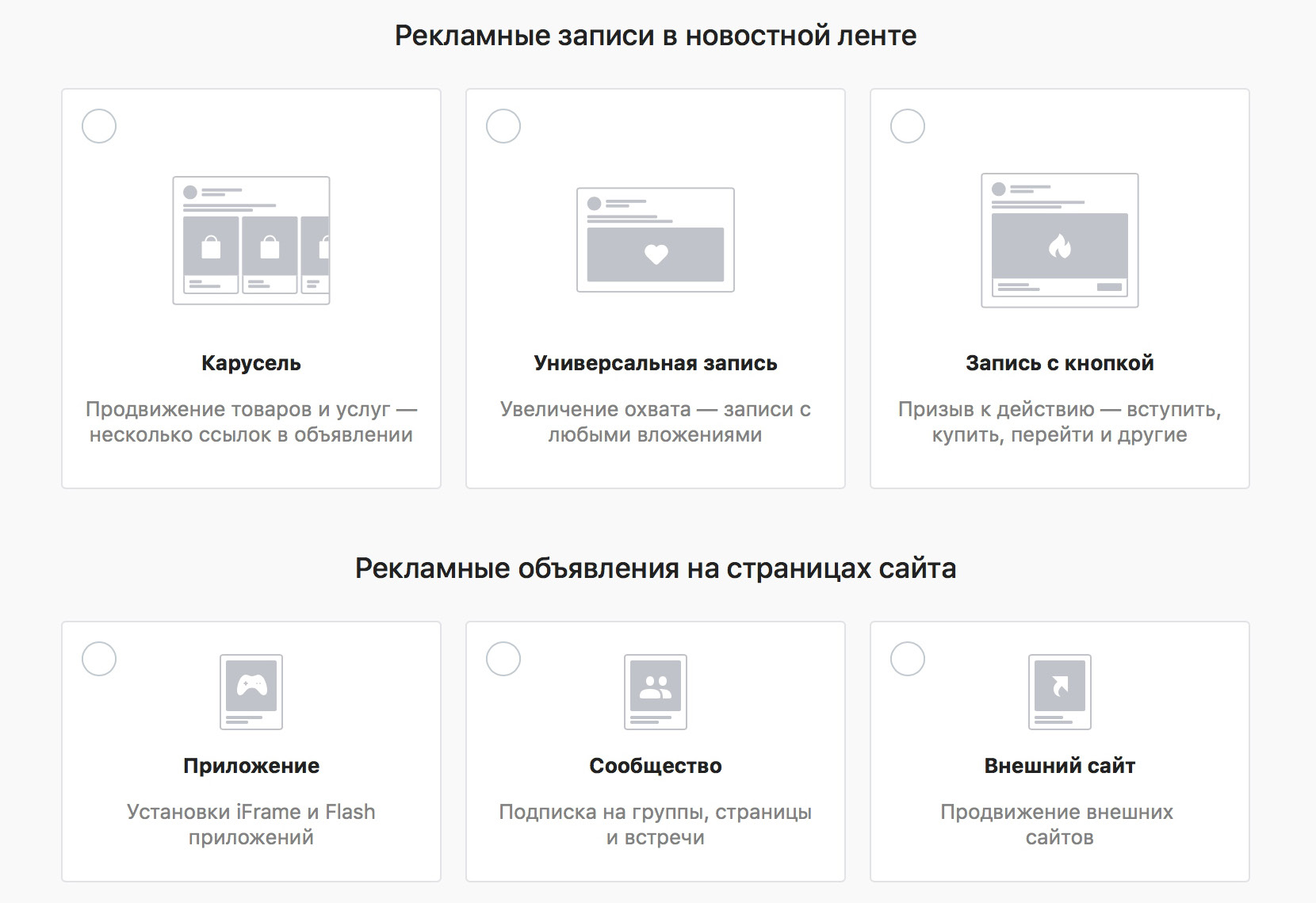 В зависимости от цели рекламной кампании на этом этапе можно выбрать формат публикации. Например, для продвижения товаров или услуг в сообществе доступны карусель, запись с кнопкой и универсальная запись — публикация с текстом и любыми вложениями в новостной ленте или сообществах.