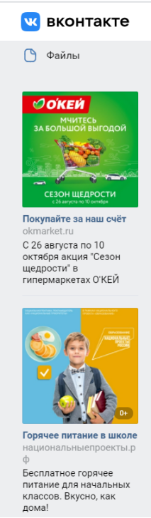 Вконтакте предлагает рекламу на страницах сайта и в новостной ленте. В обоих случаях есть несколько форматов: баннер, карусель, ссылка на приложение или сообщество и т.д.