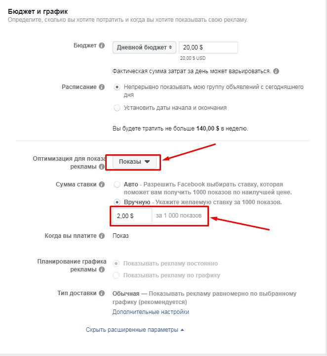 Никогда не выставляйте ту цену за 1000 показов или за 1 клик, которую предлагает FaceBook. Она завышена. Смело делите её пополам. Далее отслеживайте конверсию и корректируйте настройки исходя из полученных результатов.